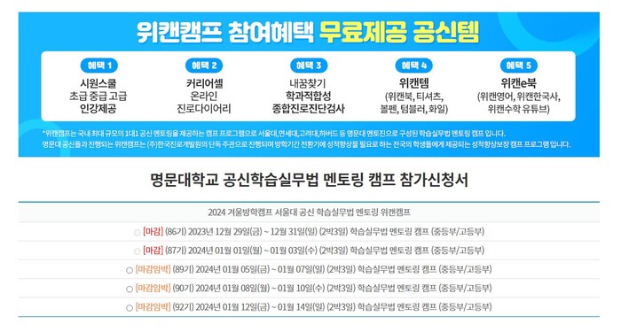 위캔캠프 겨울방학 공신캠프 상세 정보 확인 및 참가 신청은 위캔캠프 공식 홈페이지에서 가능하다.