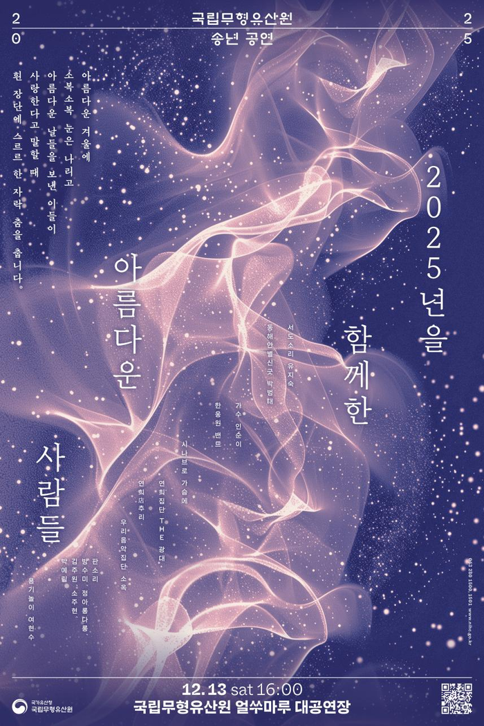 [매일안전신문=이종신기자] 국가유산청 국립무형유산원이 오는 13일 오후 4시, 국립무형유산원 얼쑤마루 대공연장(전북 전주시)에서 올 한 해 공연을 마무리하며 관객들에게 감사의 마음을 전하는 송년공연 <2025년을 함께한 아름다운 사람들>을 개최한다.