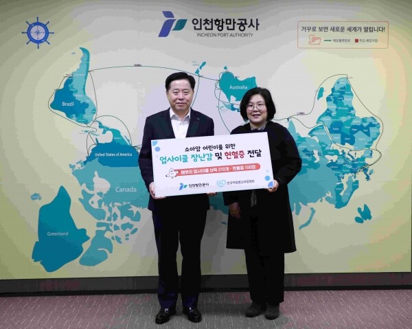 [매일안전신문=이종신 기자] 인천항만공사가 연말을 맞아 한국백혈병소아암협회 경인지회에 지역 소아암 환아들을 위한 새활용 장난감(업사이클 굿즈) 210개와 헌혈증 100장을 전달했다.