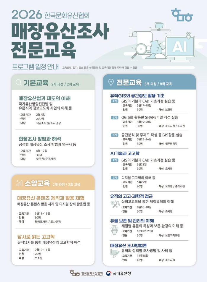 교육은 2월 5일 실시하는 ‘매장유산법과 제도의 이해’를 시작으로 3개 분야 9개 과정에 걸쳐 총 12회 진행된다. 매장유산 법령의 이해부터 현장조사 방법과 해석, 유적 지리정보시스템과 공간정보 활용, 인공지능(AI) 기술과 고고학, 유물 보존 및 관리의 이해, 매장유산 콘텐츠 제작과 활용 체험 등 실무 전반을 아우르는 과정으로 구성되었다. 신청 방법과 자세한 교육 일정은 한국문화유산협회 교육 누리집에서 확인할 수 있으며, 전화를 통한 문의도 가능하다.