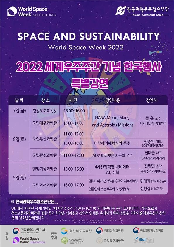 한국과학우주청소년단(총재 서상기)은 과학기술정보통신부(이하 과기정통부) 후원으로 세계우주주간을 기념해 ‘2022 세계우주주간 한국행사’를 개최한다고 4일 밝혔다.