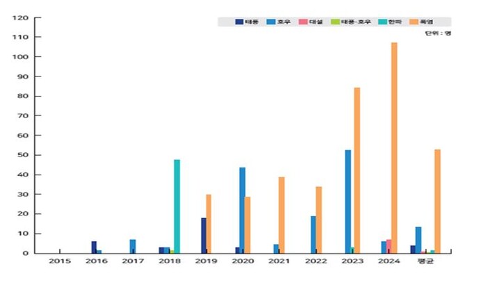 자연재난으로 인한 사망·실종자는 총 121명으로, 최근 10년 평균(56명) 대비 65명 증가했다. 원인별로는 폭염으로 인한 사망(108명)이 가장 많았고, 이 외 대설(7명), 호우(6명) 순으로 많았다.
