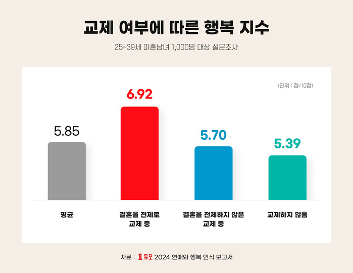 한국 2030 미혼남녀의 평균 행복지수는 10점 만점에 5.85점이었다. 이는 UN이 발표한 한국의 행복지수(6.058점)보다 약간 낮았다.