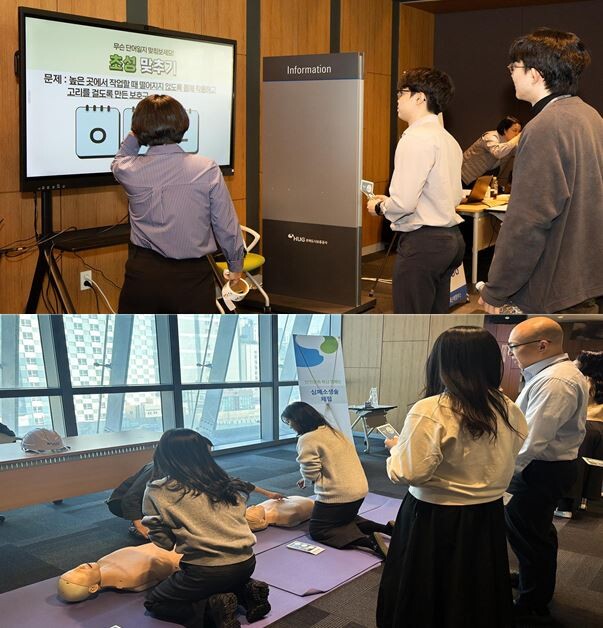 | ▲허그(HUG) 직원들이 안전보건 OX퀴즈, 심폐소생술 체험 부스에 참여하고 있다. (사진=주택도시보증공사 제공) |