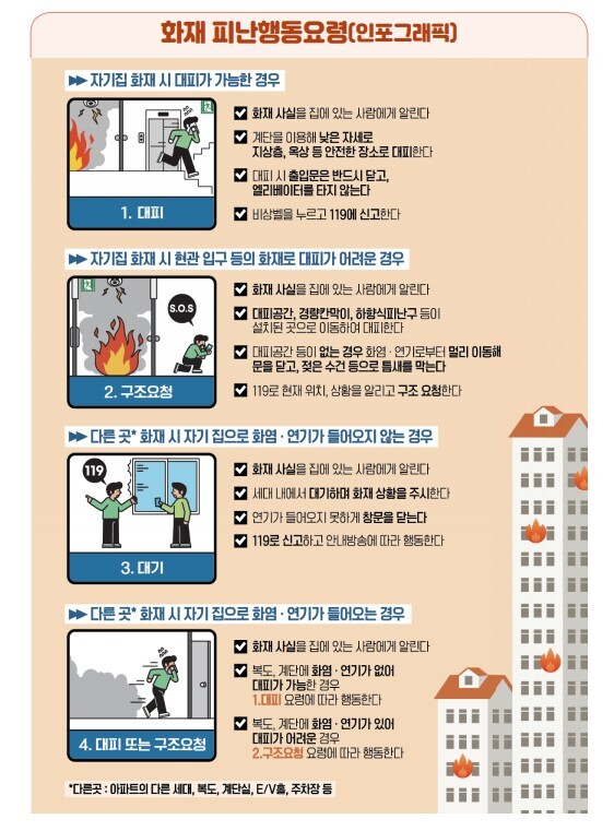 소방청은 최근 아파트 화재가 잇따르는 상황에서 인명피해를 줄이기 위해 관계부처 합동 지침을 바탕으로 한 공동주택 화재 피난행동요령을 안내하고, 무리한 대피보다 화재 상황에 맞는 판단과 행동이 중요하다고 17일 밝혔다.