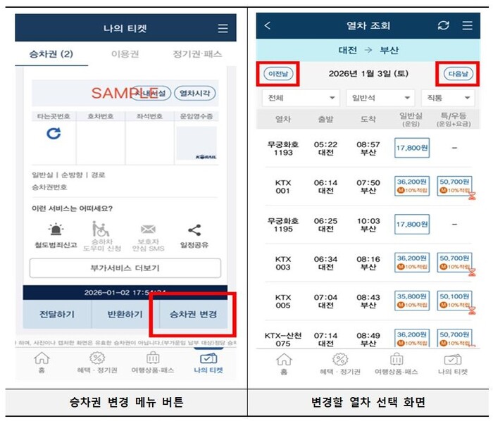 변경 가능한 열차의 범위도 넓혔다. 기존에는 승차 당일 열차로만 바꿀 수 있었으나, 이제 같은 구간이라면 승차일 기준 ‘앞·뒤 7일 이내’ 운행하는 열차 중에서 자유롭게 고를 수 있다.