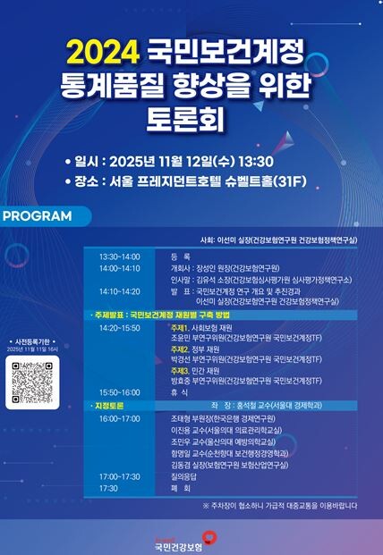 국민건강보험공단이 오는 12일 서울 프레지던트호텔에서 ‘2024년 국민보건계정 통계품질 향상을 위한 토론회’를 개최한다고 10일 밝혔다.