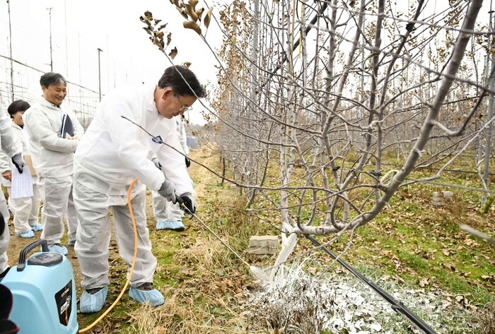 | ▲지난달 16일 이승돈 농촌진흥청장이 숲으로트리가드 시범 도포하는 모습 (사진=KCC 제공) |