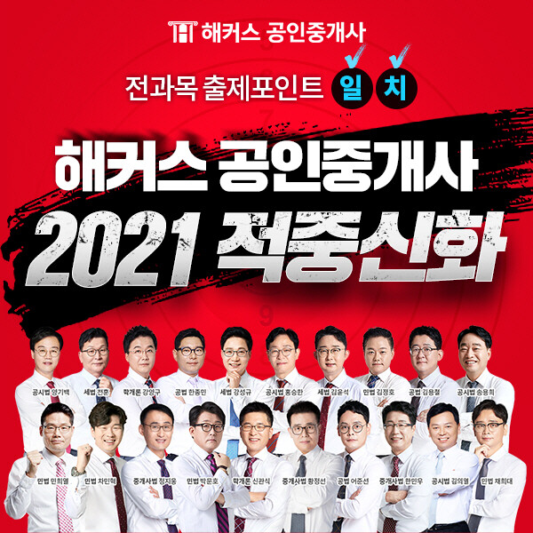 해커스 공인중개사가 적중 내역 이벤트 페이지에서 베스트셀러 1위 교재와 2021년 진행된 실제 시험 문제들의 지문이나 보기가 일치한 적중 내용을 공개했다고 밝혔다.