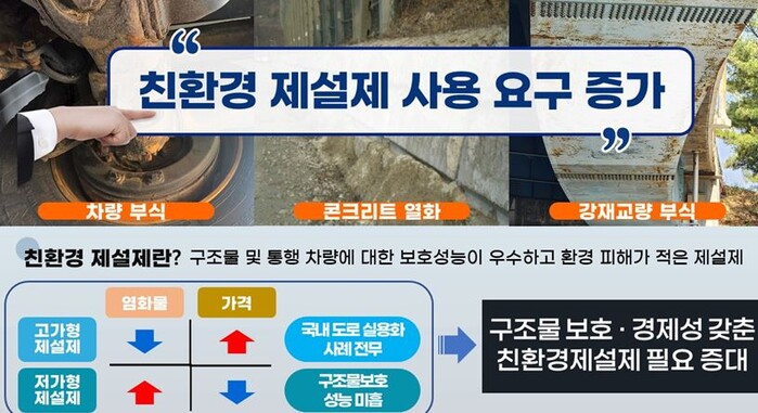 최우수 과제는 비염화물계 제설제 개발·사용으로 일반 제설제 대비 고속도로 구조물 파손과 이용 차량의 부식을 완화하는 ‘산업폐기물을 재활용한 다기능성 제설제 실용화’가 선정됐다.