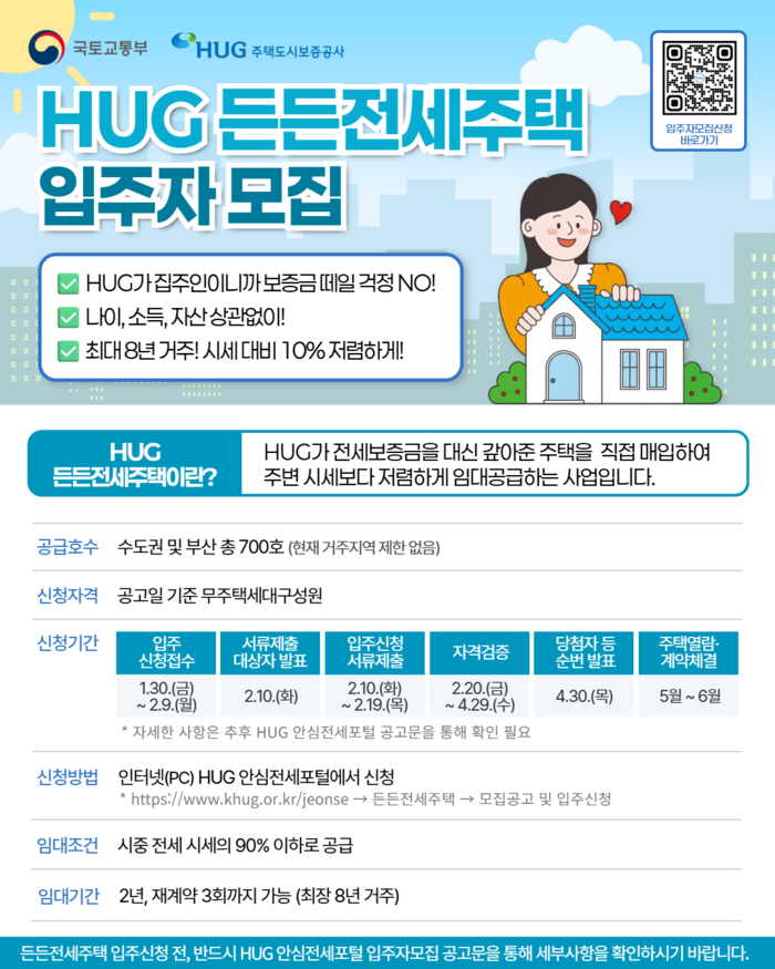 윤명규 HUG 사장직무대행은 "이번 제9차 든든전세주택 모집에도 많은 관심을 부탁드린다"며 "올해는 공급 규모를 더욱 확대하고 품질 관리도 강화해 청년과 신혼부부 등 무주택 가구의 주거 안정을 적극 지원하겠다"고 말했다.