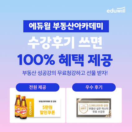 에듀윌 부동산아카데미는 에듀윌 부동산 성공강의 무료 청강 후 수강 후기 작성 시 선물을 증정하는 이벤트를 진행한다고 27일 밝혔다.