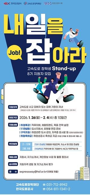 [매일안전신문=김혜연 기자] 한국도로공사와 고속도로장학재단이 고속도로 사고 피해자 및 피해 가정 자녀를 대상으로 1월 26일부터 2월 4일까지 취업 지원 프로그램 ‘Stand-up’ 8기 참가자를 모집한다.