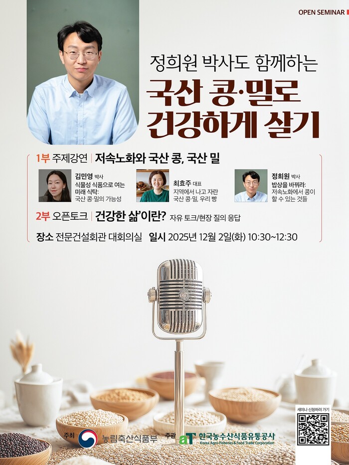 농림축산식품부와 한국농수산식품유통공사가 오는 12월 2일 ‘국산 콩·밀로 건강하게 살기’ 오픈세미나를 개최한다고 26일 밝혔다.