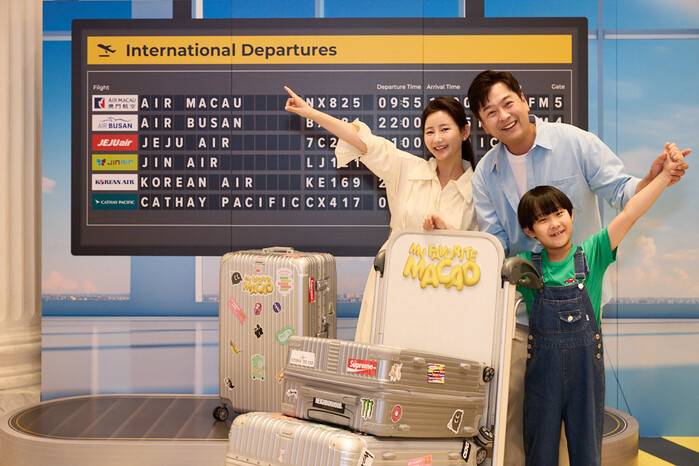 ▲마카오정부관광청은 마카오 여행에 대한 다양한 정보와 이벤트를 제공하는 ‘2024 마카오 위크 로드쇼'를 오는 30일부터 6월 2일까지 신세계 강남 센트럴시티에서 진행한다. 공항 컨셉의 포토존에서 가족들이 출국 포즈를 취하고 있다.