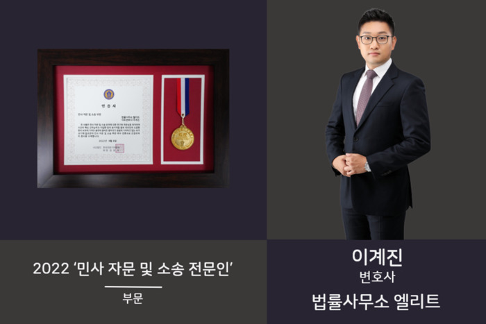 법률사무소 엘리트의 이계진 변호사가 2022년 법률서비스 ‘민사자문 및 소송 전문인’ 부문에서 전문인 인증패를 수상하는 영예를 안았다.