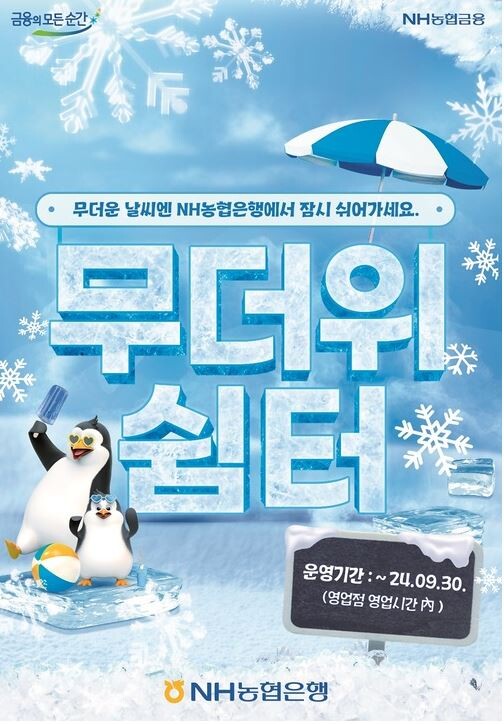 NH농협은행 관계자는 “폭염에 힘들어하시는 국민들께 조금이나마 힘이 되고자 무더위 쉼터를 운영하기 됐다‘며 ”올여름 무더위에 지칠 때 부담 없이 가까운 농협은행을 찾아 휴식을 가지시길 바란다“고 말했다.