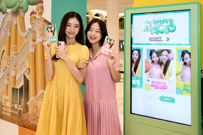 ▲마카오정부관광청은 30일 서울 신세계 센트럴시티에서 마카오 여행에 대한 다양한 정보와 이벤트를 제공하는 ‘2024 마카오 위크 로드쇼를 6월 2일까지 선보인다. 사진은 친구와 함께 SNS 이벤트에 참여해 즐거워하고 있는 참가자들의 모습.