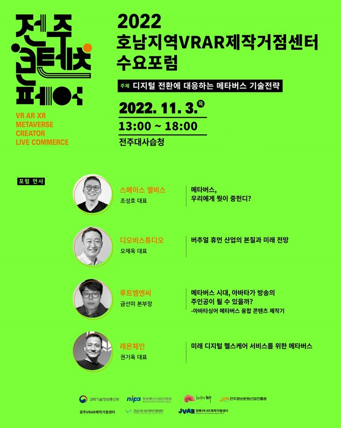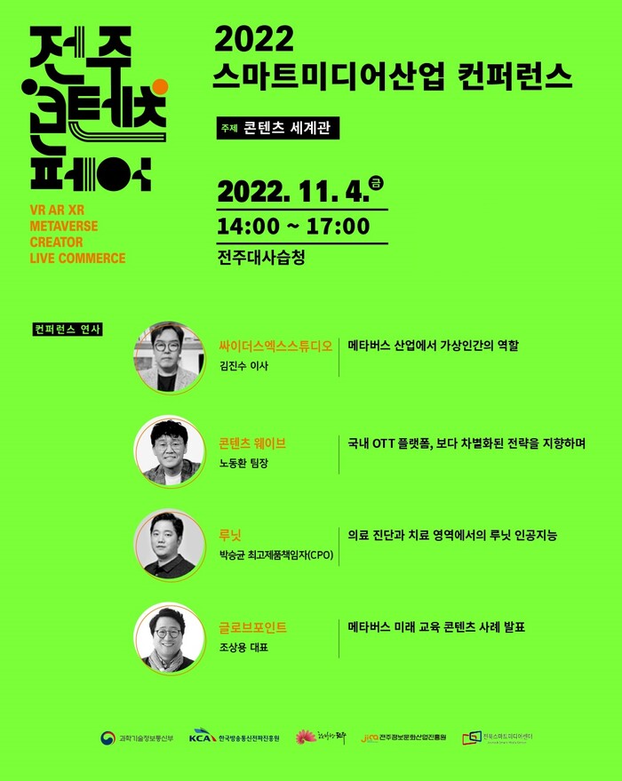 ‘2022 전주 콘텐츠 페어’가 11월 3일부터 5일까지 한옥마을 소 재 ‘전주대사습청’에서 개최되는 가운데 행사 첫째날, 둘째날인 3일과 4일에 디지털 콘텐츠 주제로 컨퍼런스가 진행된다.