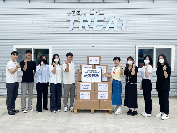 이번 기부는 대한사회복지회를 통해 한부모가정(30가정)에게 400만원 상당 아로망 바디워시&바디로션을, 30만원 상당의 생필품(휴지, 아기 물티슈, 생리대)을 전달했다.