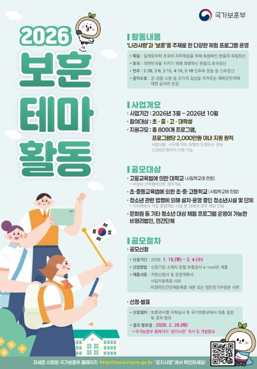 [매일안전신문=김혜연 기자] 국가보훈부가 전국의 청소년들이 일상에서 쉽고 재미있게 ‘보훈’을 체험하고 이해할 수 있도록 지원하기 위한 ‘2026년 청소년 보훈 테마활동’ 프로그램 공모를 15일부터 오는 2월 4일까지 진행한다.