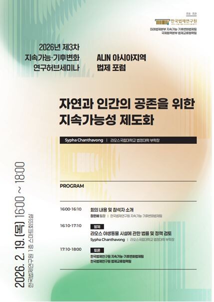 [매일안전신문=김진섭 기자] 한국법제연구원이 19일, 연구원에서 아시아법령정보네트워크(ALIN) 회원기관인 라오스 국립대학교 법정대학의 솜데트 깨오봉삭 학장과 시파 찬타봉 부학장을 초청해 ‘제2차 해외 법제 전문가 초청 특강’과 ‘제3차 지속가능·기후변화 연구허브세미나’를 개최했다.