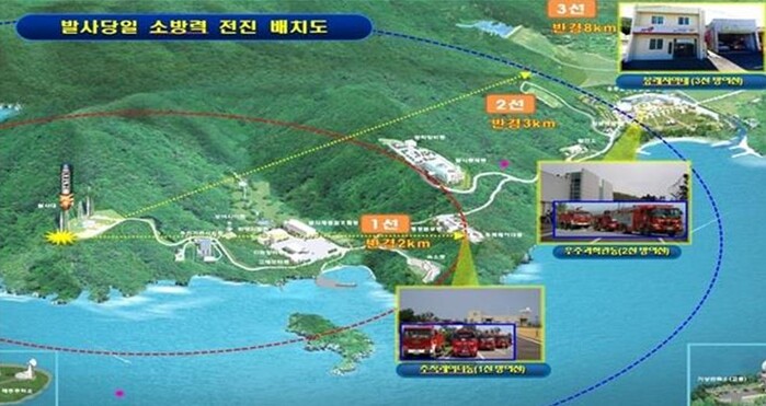▲1선(발사대 반경 2km 내)에는 고성능 화학차 등 중장비를 집중배치해 발사장 방어와 화재‧폭발 시 초기진압에 주력하고, ▲2선(반경 3km 내)에는 테러대응구조대 및 펌프차 등을 배치해 테러대비 및 인명구조, 화재‧폭발 시 연소확대 방지에 집중하며, ▲3선(반경 8km 내 나로119안전센터)에는 구급차와 펌프차 등 예비 전력을 배치해 우발 상황에 대비한다는 계획이다.