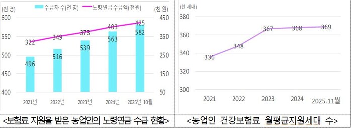 ‘농업인 연금·건강보험료 지원’은 농업인의 안정적인 노후와 의료접근성이 낮은 농촌의 의료비 부담 완화를 위한 사업으로, 농식품부와 보건복지부가 협업하여 농업인이 부담하는 보험료를 최대 50%까지 지원한다. 올해 연금보험료는 월평균 25만 5천명, 건강보험료는 월평균 36만 9천 세대의 농업인을 지원했다.