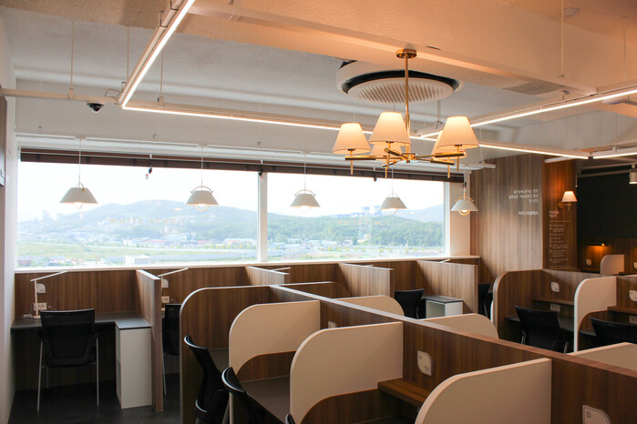 휴게실을 비롯해 개인 짐과 옷을 보관할 수 있는 보관시스템과 옷걸이 등 내부엔 이용자들이 공부뿐만 아니라 편하게 이용할 수 있는 공간들로 조성을 해두었으며, 키오스크를 이용하여 보다 편리하고 손쉽게 좌석을 선택하고 예약을 진행할 수 있게 되어있다.