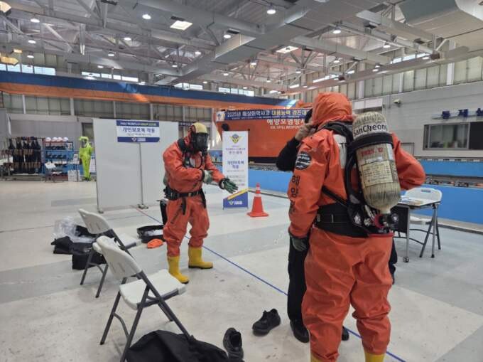 | ▲해양경찰청이 20일부터 2일간 여수 해양경찰교육원 일원에서 해상화학사고 현장 대응요원의 전문성과 대응역량을 강화하기 위해 해상화학사고 대응능력 경진대회를 개최하였다.(개인보호구 착용 평가 모습) (사진=해양경찰청 제공) |