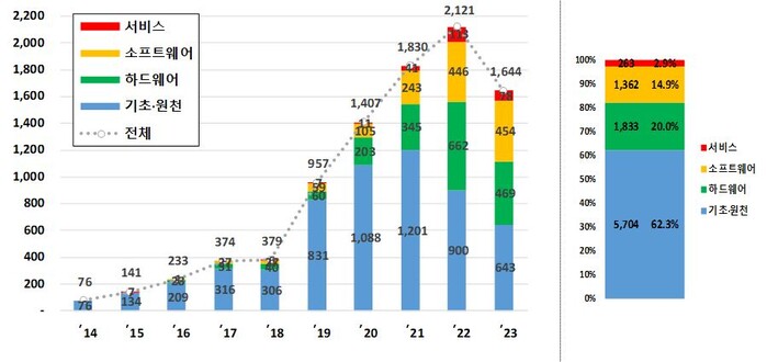 특히 미국과 중국이 전체 출원의 약 70% 이상을 차지하며 국제 기술 경쟁을 주도하고 있으며, 두 국가는 기초·원천 연구뿐 아니라 하드웨어·소프트웨어 분야에서 상용기술 출원을 집중적으로 확대하고 있다. 우리나라의 출원 비중은 아직 낮지만, 중국(123.7%), 이스라엘(109.1%)에 이어 연평균 증가율 3위(58.5%)를 기록했으며 하드웨어·소프트웨어 중심의 상용기술 출원이 꾸준히 증가하고 있어 산업화 초기 확산 단계에 진입한 것으로 평가된다.