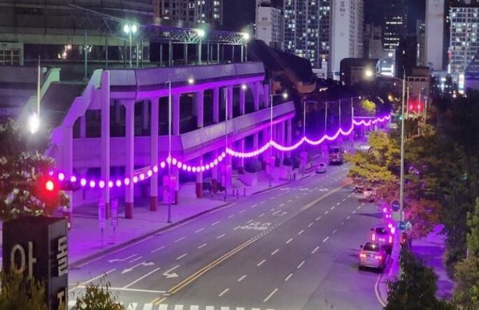 | ▲ BTS 콘서트를 앞두고 보랏빛으로 물든 아시아주경기장 일대 모습(사진, 부산시 제공) |