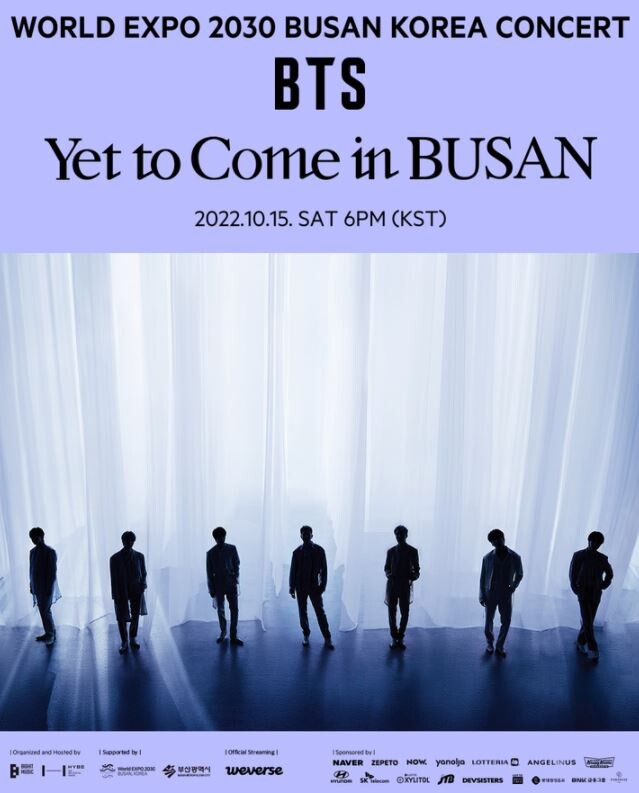 2030 부산세계박람회 유치를 기원하는 BTS ‘Yet To Come’ in BUSAN은 이달 15일 오후 6시 열리며 JTBC를 통해 생중계된다.