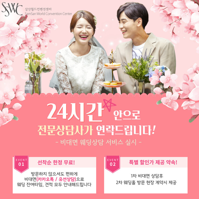 삼산월드컨벤션센터는 포스트코로나 이후로 비대면 웨딩 상담서비스가 종료돼 불편함을 겪는 예비부부들을 위해 홈페이지, 카카오톡, 유선으로 비대면 상담을 요청하면 24시간 내 웨딩 잔여타임, 비교견적을 무료로 제공한다고 밝혔다.