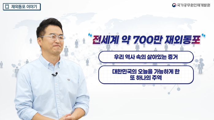 이에 국가공무원인재개발원 ‘2025년 이러닝 콘텐츠 개발 사업’의 일환으로 국가·지자체 공무원 대상 재외동포에 대한 이해도를 높이는 이러닝 콘텐츠를 2025년에 개발해 11월 10일부터 약 3주간의 테스트 기간을 거쳐 12월 1일 나라배움터에 공개했다.