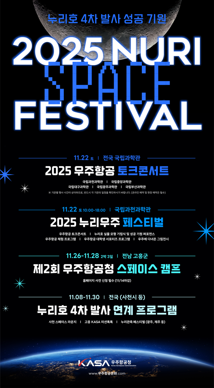 [매일안전신문=김진섭 기자] 우주항공청이 11월 22일부터 누리호 4차 발사의 성공을 기원하고 국민들의 우주항공 이해 증진을 위해 지자체, 과학관, 천문대와 연계한 ‘우주항공 토크콘서트’ 등 다양한 프로그램을 전국 각지에서 개최한다.