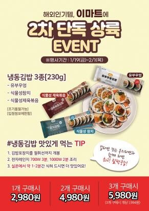 | ▲ 이마트가 냉동김밥 3종 14만개를 준비해 내달 1일까지 판매한다.(사진, 이마트 제공) |