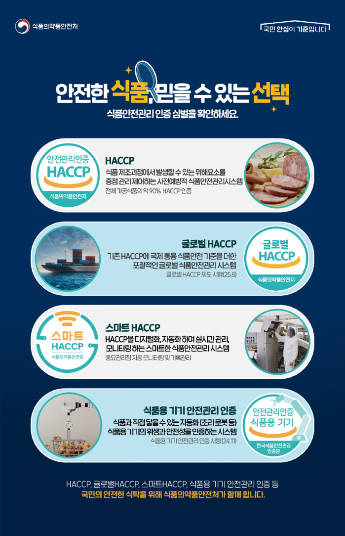 ‘해썹(HACCP) 제도’는 1995년 도입된 이후 식품 안전에 대한 국민 의식 수준이 높아지고 산업 환경이 급변함에 따라 ‘스마트 해썹’, ‘글로벌 해썹’, ‘식품용 기기 안전관리 인증’ 등으로 확대·고도화되어 왔으며, 우리 식품 안전 관리 체계의 글로벌 경쟁력 강화에 기여하는 대표적인 정책으로 자리매김했다.