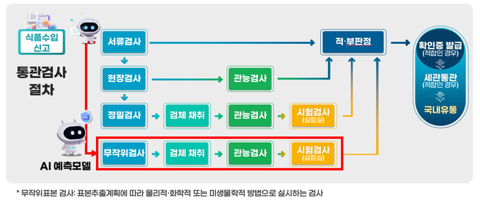 ‘인공지능(AI) 기반 수입식품 위험예측 검사시스템’은 축적된 과거 부적합 내용, 원재료 등 수입식품 검사 정보와 해외 환경·위해정보를 융합한 빅데이터를 인공지능(AI)이 학습하여 부적합 가능성(위험도)이 높은 수입식품을 통관 단계에서 무작위검사* 대상으로 자동 선별하는 모델이다