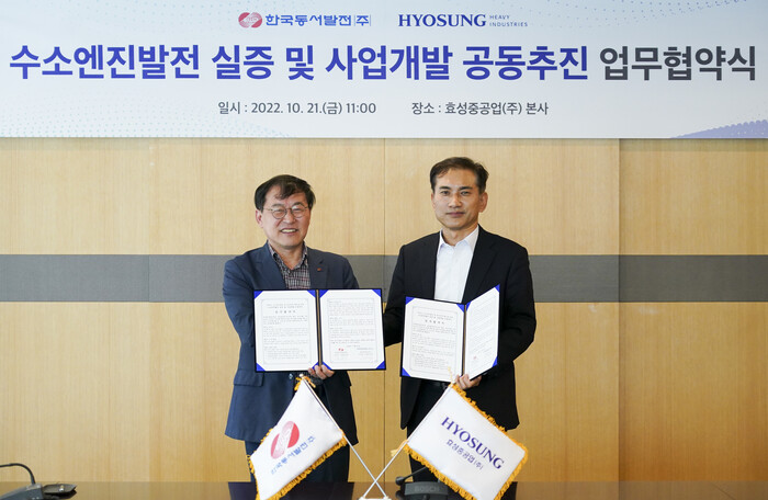 한국동서발전은 효성중공업과 21일 11시 서울 마포구 효성중공업 본사에서‘수소엔진발전 실증 및 사업개발 공동추진’업무협약을 체결했다.