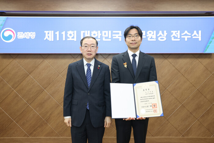 | ▲이명구 관세청장(왼쪽)이 제11회 대한민국 공무원상 수상자로 선정된 관세청 박용환 주무관에게 시상하고 있다 (사진=관세청 제공) |