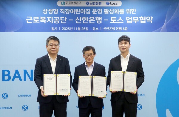근로복지공단이 26일 서울 중구 신한은행 본점에서 신한은행, 토스와 함께 저출생 문제에 공동 대응하고 중소기업 근로자의 보육 부담 완화를 위해 ‘상생형 직장어린이집 활성화’ 업무협약을 체결했다.