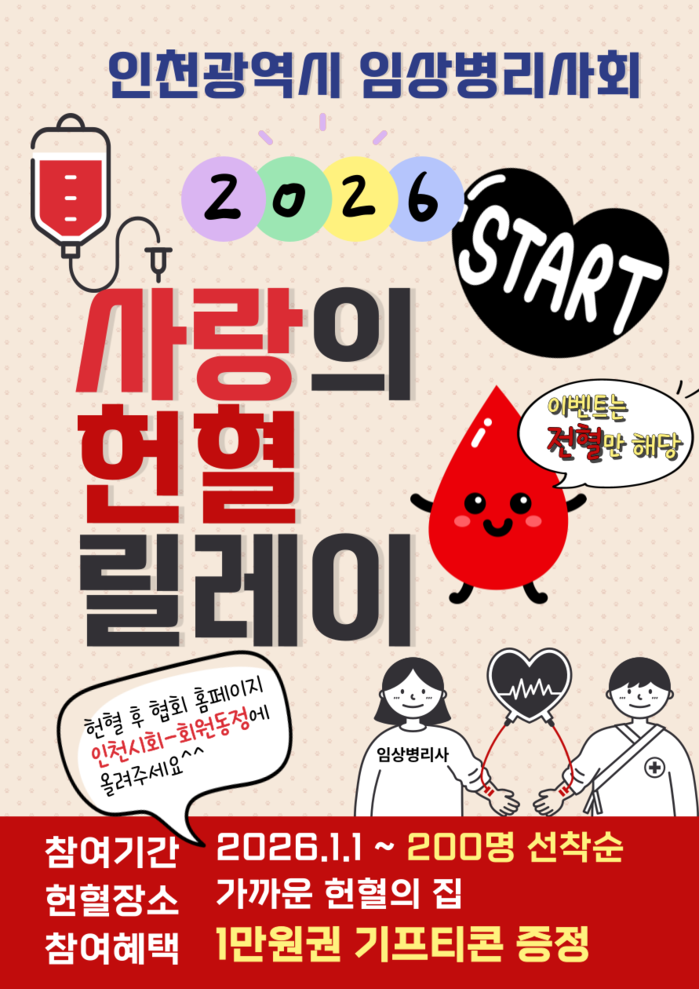 김영섭 인천혈액원장은 “혈액의 중요성을 누구보다 잘 아는 임상병리사들이 자발적으로 나선 이번 캠페인은 의료 현장과 지역사회가 함께 위기를 극복하는 모범적인 사례”라며 “인천혈액원은 이러한 연대가 안정적인 혈액수급으로 이어질 수 있도록 적극 뒷받침하겠다”고 감사의 뜻을 전했다.