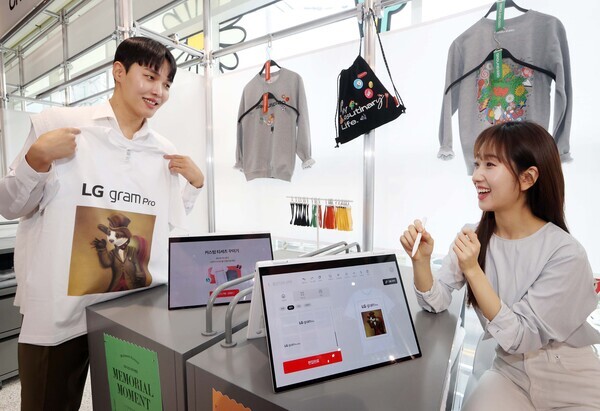 | ▲서울 영등포구 양평동에 위치한 LG전자 그라운드220 방문객이 LG 그램 프로로 만든 AI 이미지를 프린팅한 나만의 티셔츠를 만들고 있다 (사진=LG전자) |