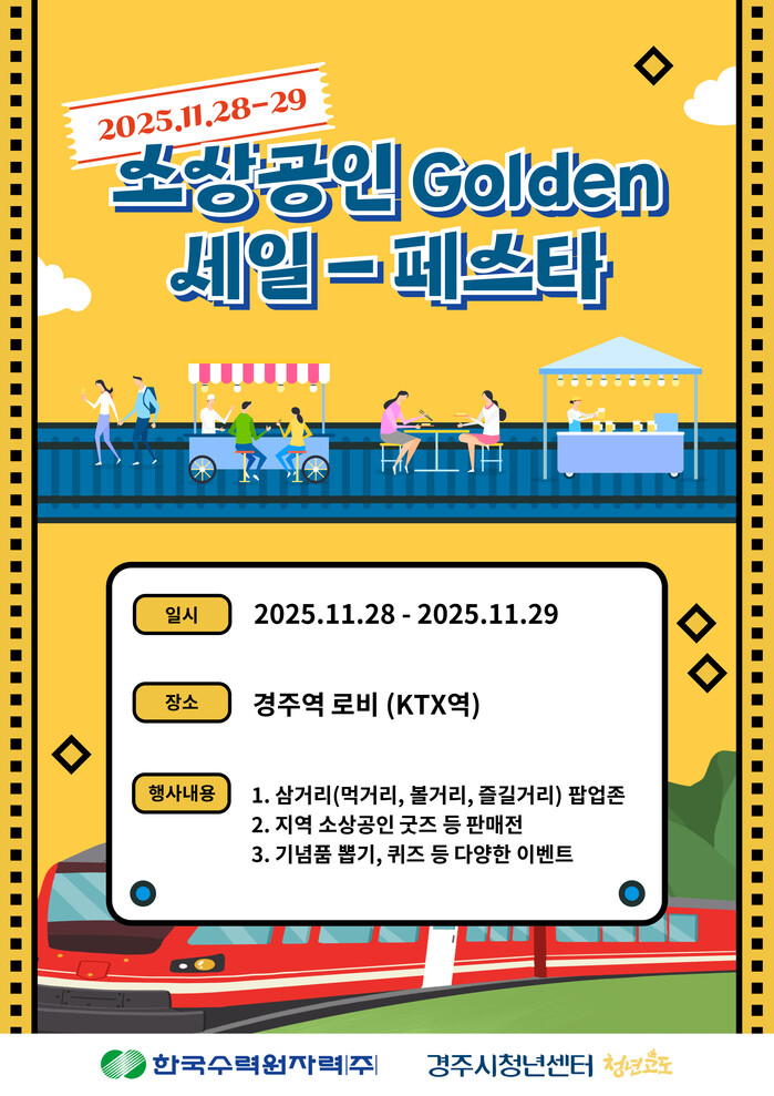 [매일안전신문=김진섭 기자] 한국수력원자력과 경주시청년센터가 28일과 29일 양일간 경주역에서 ‘소상공인 골든 세일-페스타(팝업스토어)’ 축제를 개최한다.
