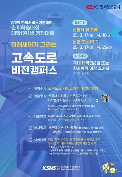 또한, 대상.최우수상 수상자에게는 한국서비스경영학회가 발행하는 학회지에 논문 게재 기회를 부여하고, 수상자 전원에게는 ’한국도로공사 체험형 청년인턴‘ 채용 시 서류전형 가점 부여 등 우대사항을 적용한다.