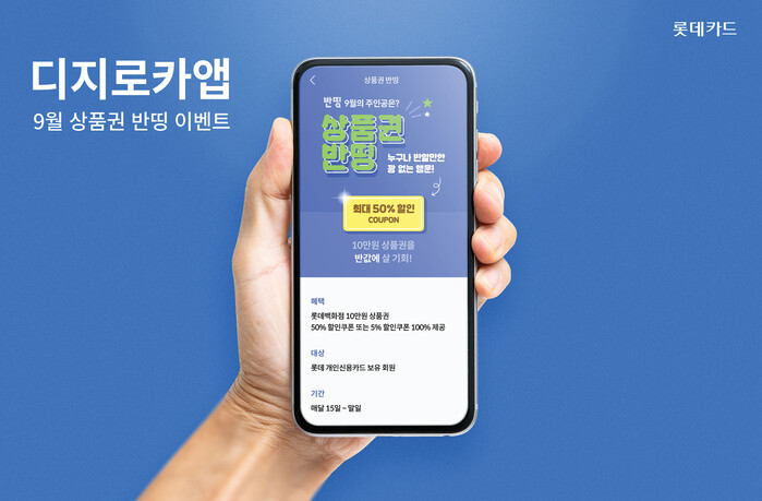 롯데카드는 디지로카앱에서 상품권 50% 할인쿠폰을 추첨해 증정하는 ‘상품권 반띵’ 이벤트를 진행한다고 15일 밝혔다.