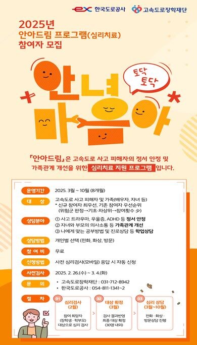 한국도로공사가 고속도로 사고 피해자들에 대한 심리치료 프로그램 '안아드림' 참여자를 모집한다고 25일 밝혔다.