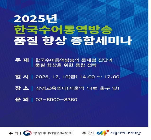 방송미디어통신위원회가 시청자미디어재단과 함께 19일 서울에서 한국수어통역방송의 문제점을 진단하고 품질향상 방안을 논의하기 위해 ‘2025 한국수어통역방송 품질향상 종합세미나’를 개최했다.