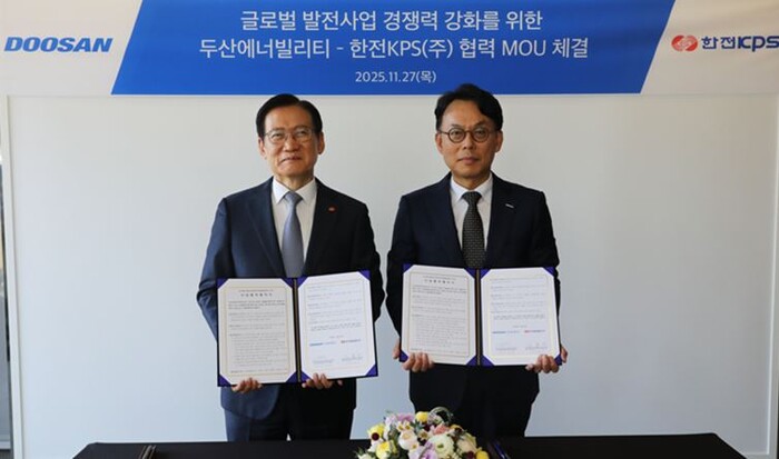 한전KPS가 27일 창원 두산에너빌리티 본사에서 양사간 해외 발전 프로젝트의 공동 개발 및 사업 확대를 위한 협력 강화를 목적으로 ‘사업협력 MOU’를 체결했다고 28일 밝혔다.